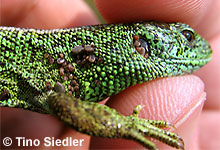 Zauneidechse: Männchen mit Zecken, an dem Tier saßen über 80 Zecken.